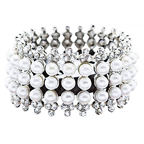 -. Feature : Color: Silver, Clear, White / Material: Clear Crystal Rhinestones, White Faux Pearls, Metal Casting, Rhodium Plated / Style: Chunky, 3 Rows Pearls, Texture / Dimensions (Size): Approx. 1.35" Wide, Stretchable / Quantity: 1 Bracelet / Lead Compliant