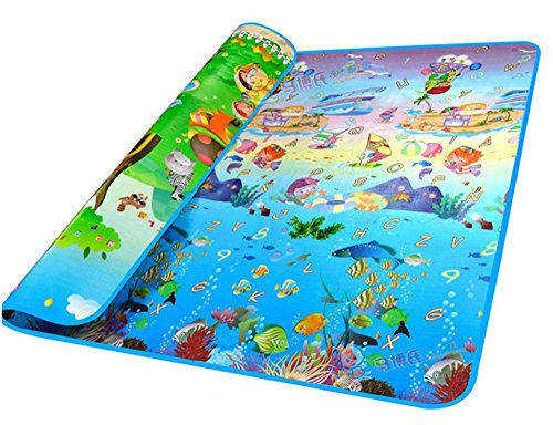 -. Feature : Material: OPP + PE Cotton / Size: 78 x 70 inch and 0.2 inch thickness / Beautifully illustrated mat has a lot of fun developmental features to keep baby entertained / Perfect for reducing noise and impact, and a great insulator on all floor surfaces / Water proof and easy to clean, Mat can be used indoor and outdoor and is hand washable