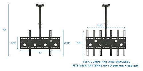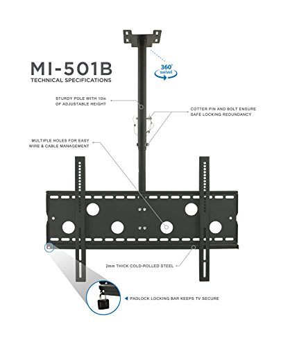 -. Binding : Electronics -. Brand : Mount-It! -. Color : Black -. EAN : 0628586132368 -. Feature : FULL MOTION CEILING BRACKET - Swivels 360 degrees for full rotation and maximum flexibility. Tilts down 20 degrees for best viewing angle. Perfect for offices, bars, restaurants, dental clinics, fitness centers, grocery stores, medical offices, home installations and more / VESA TV CEILING MOUNT - Universal design fits TVs from 32 inches to 70 inches. This bracket works VESA patterns 200x200, 300x300, 400x200, 400x300, 400X400, 600x200, 600x300, 600x400, 600x450, 700x400, 700x450, 800x200, 800x400, 800x450. / HEIGHT ADJUSTABLE - Adjust the height of the TV between 22.4 inches to 31.4 inches, from the ceiling to the middle of TV. / EASY INSTALLATION - Install to your ceiling and TV in minutes. Standard hardware required to fasten your LCD to your ceiling mount included. Installation manual provides step by step instructions. / HEAVY-DUTY TV HANGER - Sturdy steel pole and bracket with 175 lbs capacity. Comes with cable management. -. Label : Mount-It! -. Manufacturer : Mount-It! -. Model : MI-102 -. MPN : MI-102 -. PackageQuantity : 1 -. PartNumber : MI-102 -. ProductGroup : CE -. ProductTypeName : AV_FURNITURE -. Publisher : Mount-It! -. Studio : Mount-It! -. Title : Mount-It! Ceiling TV Mount For 32 37 40 42 43 50 55 60 65 70 Inch Flat Panel Televisions, Articulating Hanging Swivel TV Pole Bracket Adjustable Height 175 Pound Capacity, Black (MI-501B) -. UPC : 628586132368