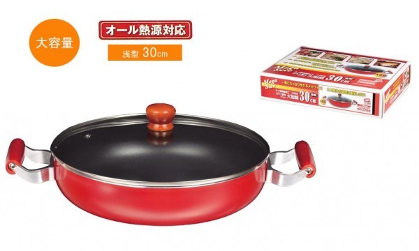 | 仕様 | オール熱源(ガス、IH100V・200V、シーズヒーター、ハロゲンヒーター、エンクロヒーター、ラジエントヒーター)対応 浅型30cm 食洗機非対応 表面加工/内面:ふっ素樹脂塗膜加工、外面:焼付け塗装 強化の種類:全面物理強化 |