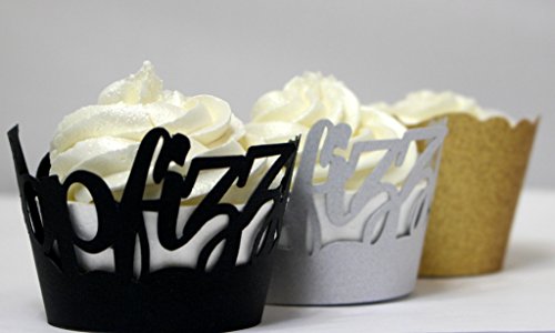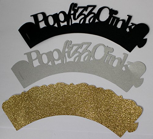 - Each pack includes; 8pcs glitter gold cupcake wrappers, 11 pieces of shimmer silver Pop, Fizz, Clink cupcake wrappers & 13 pieces black Pop, Fizz, Clink cupcake wrappers