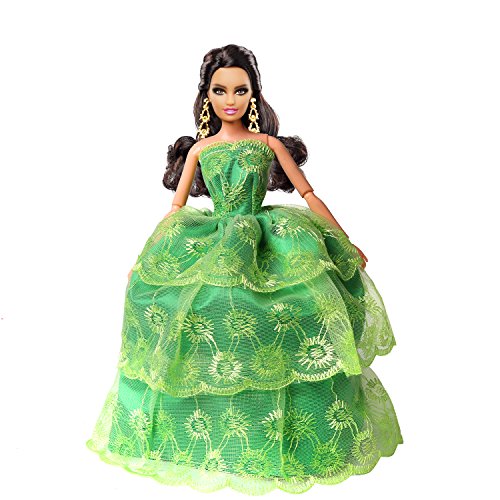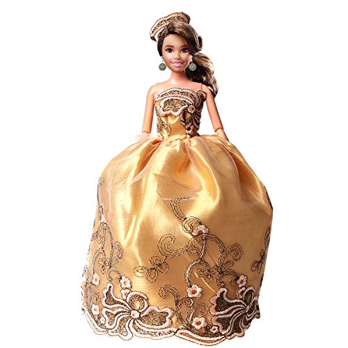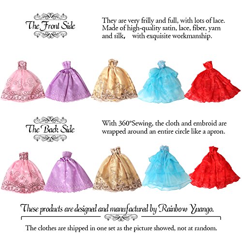 -. Feature : Custom made to fit the 11.5 inch doll. Made of satin, lace, fiber, yarn and silk. These products are designed and manufactured by Rainbow Yuango. We guarantee your doll will look her best, unique, adorable and cuddly. With a Velcro (Sticky buckle) on the back. Easy to take on and off. / Made of high-quality environmental yarn and silk which are light and safe enough for your baby snuggle the doll in arm and play for all day. It ensures the barbie doll dresses are durable and tear-proof enough to stand wear and tear years. The needlework adds more beautiful and gorgeous feels. / They are very frilly and full, with lots of lace. With 360°Sewing, the cloth was wrapped around an entire circle like aprons. With exquisite workmanship as well as precise and skillful handmade, every seam of the barbie doll dress is tight and well stitched. / 5 styles in one collection. Dolls and decorations in the picture are not included. The clothes are shipped in one set as the picture showed, not at random. Sweet gift for home decoration, children birthday, Christmas, Thanksgiving, baby shower and other memorial day. / Clean: Firstly wipe the dust off with dry cotton cloth. Use cotton cloth dipped in cold water to gently wipe the stain. Do not use cleaning agents or hot water, so as not to damage the surface of the pigment layer. Storage: Could separate the body from clothing when store your barbie doll.To store your barbie doll clothes in a ventilated and moisture-proof place.