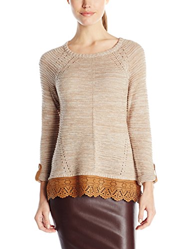 Crew neck sweater with faux suede trim missy style with roll tab sleeve