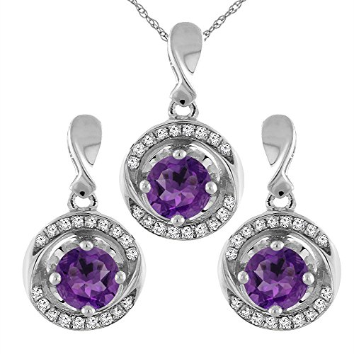 -. Title : 14K White Gold Natural Amethyst Earrings and Pendant Set with Diamond Accents Round 4 mm