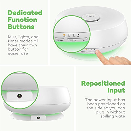 IMPROVED DESIGN FOR BETTER USE: Buttons for mist, lights, and timer, with a repositioned input to plug in without spilling water; includes three timer modes (1H, 2H, 3H)