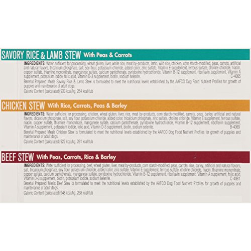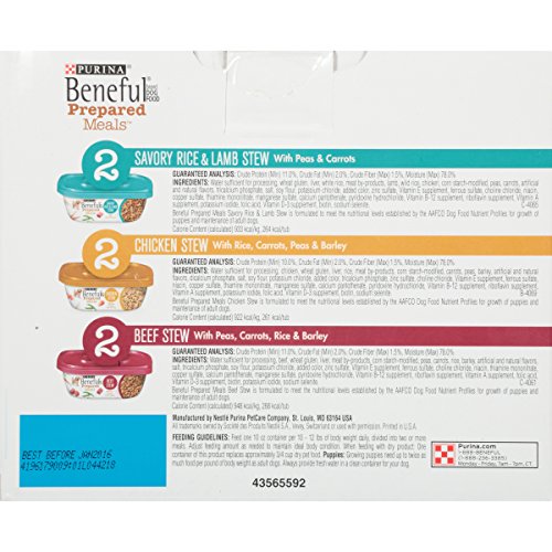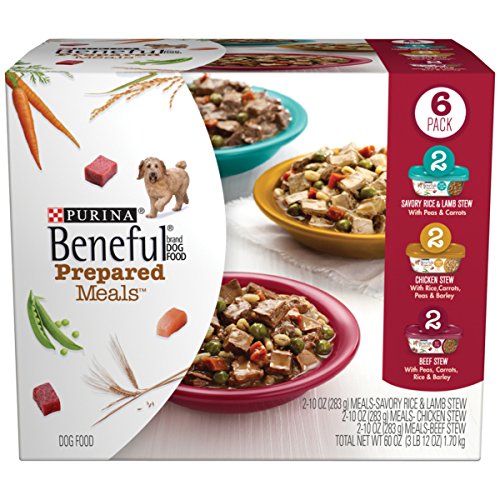 -. Binding : Misc. -. Brand : Purina Beneful -. EAN : 0017800151047 -. Feature : Six (6) 10 oz. Tubs of Purina Beneful Prepared Meals, Stew Variety Pack / Six count variety pack includes three different recipe options to add variety to his diet / Made with real beef, chicken or lamb for high-quality protein and delicious flavor / Real carrots, peas and whole grains deliver wholesome goodness you can see / 23 essential vitamins and minerals support his active lifestyle / Medium-sized chunks and tender bites for easy eating -. Label : Purina Beneful -. Manufacturer : Purina Beneful -. Model : 11059662 -. MPN : 11059662 -. NumberOfItems : 6 -. PackageQuantity : 1 -. PartNumber : 11059662 -. ProductGroup : Pet Products -. ProductTypeName : PET_SUPPLIES -. PublicationDate : 2012-05-24 -. Publisher : Purina Beneful -. Size : 10 oz. Tub - Pack of 6 -. Studio : Purina Beneful -. Title : Purina Beneful Prepared Meals Stew Variety Pack Wet Dog Food, (6) 10 oz. Tubs -. UPC : 017800151030