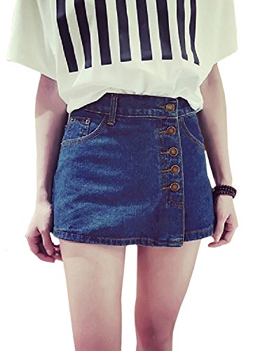 -. Feature : 台形シルエットで仕上げたスカート。斜めに入ったボタンデザインが特徴のミニスカート調ショートパンツ。ミニ丈でもキュロットだから安心。アンティークな雰囲気のボタン使いや味わい深い濃色など、こだわりのディテールにクールなこなれ感が漂います。 / 思いっきりミニの可愛い台形デザインで脚長効果あり。ベルトを着けることができるので、ウェストサイズを気にせずに着用できます。使いやすさはそのままに、周りとちょっぴり差の付くコーディネートになる嬉しいアイテム。 / デニムなのに、ゴワゴワ感無く、柔らかい素材です。少々大きめで、トップスインもOK。トップス合わせに困らない着回し力の高さも強みです、シンプルなデザインで着回し自由自在。レギンスやタイツと合わせて、オールシーズン着回しを楽しめます。 / 【大きさ】(S)ウェスト約68cm、ヒップ約86cm、もも径約50cm、着丈約31cm (M)ウェスト約72cm、ヒップ約90cm、もも径約52cm、着丈約32cm (L)ウェスト約76cm、ヒップ約94cm、もも径約54cm、着丈約33cm (XL)ウェスト約80cm、ヒップ約98cm、もも径約56cm、着丈約34cm / 【主な素材】綿(デニム) 【カラー】紺(ネイビー) 【仕様】脱着ボタン&ファスナー、ポケット5つ、ベルト可、裏地無し