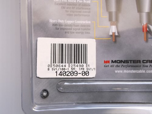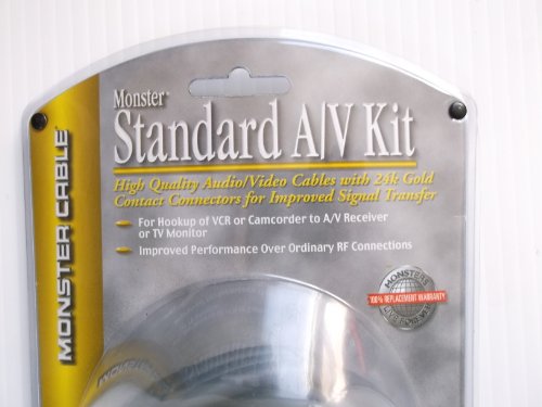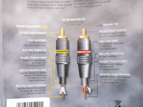 Studio : Monster Publisher : Monster Binding : Electronics Product Description ENTRY-LEVEL STEREO A/V CONNECTOR KIT A/V CABLES DESIGNED TO ENHANCE THE PERFORMANCE OF VCRS TVS CAMCORDERS A/V RECEIVERS 1 PIECE MONSTER STANDARD VIDEO CABLE FOR AN IMPROVED PICTURE WITH MINIMUM SIGNAL LOSS 1 PAIR INTERLINK 100 CABLE FOR IMPROVED SOUND FROM A SYSTEM S AUDIO OUTPUTS IDEAL FOR STEREO VCR DUBBING MONSTER QUALITY A/V KIT IS A STEP UP FROM ORDINARY A/V CONNECTION KITS RECOMMENDED APPLICATION: TV VCR CAMCORDER TO A/V RECEIVER OR HOME AUDIO SYSTEM MODEL NO. BSV1100-1.5M 1.5 M (4.92 FT) 0