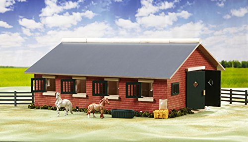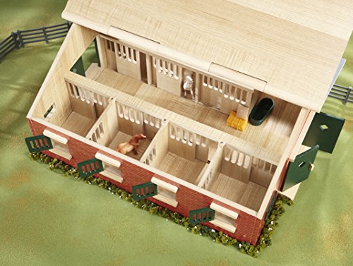 Breyer's Deluxe Stable Set is the ultimate accessory for fans of Breyer's 1:32nd scale Stablemates horses. This 7-stall barn also has a special tack room, and is loaded with the equiptment needed for a busy riding stable. This set also includes a grey Peruvian Paso, a red roan pony, 12 pieces of fencing, feedbag, water trough, hay bale, and a 5" x 7" sheet of stickers to personalize the stable. Assembled finished stable size: 28"L x 16.34"W x 8.625"HFeature