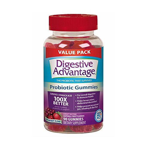 ReleaseDate : 2017-09-06 Studio : Reckitt Benckiser Publisher : Reckitt Benckiser Binding : Health and Beauty Product Description Digestive Advantage Probiotic Gummies is the easiest and most delicious way to get your daily probiotics. They are made with natural fruit flavors and no artificial preservatives, so they are guilt free. They target your specific digestive health needs and with continued use, gives you long-term digestive support. It helps to lessen minor abdominal discomfort, bloating and helps reduce occasional diarrhea. What are probiotics? Probiotics are beneficial bacteria that live in your digestive tract and promote digestive and immune health. But many probiotics don't survive the harsh acidic stomach environment to get to the intestines where they do their work. But Digestive Advantage contains BC30, a patented probiotic that survives 100x better than leading probiotics and yogurt so it can deliver good bacteria where you need it. These statements have not been evaluated by the Food and Drug Administration. This product is not intended to diagnose, treat, cure or prevent any disease. Based on median % survivability of Digestive Advantage probiotic vs. leading probiotic supplements and 19 probiotic yogurts in simulated gastric PH for 2 hours. Survivability and delivery of probiotic cells to the small and large intestines is one of the several factors influencing overall product effect. 0