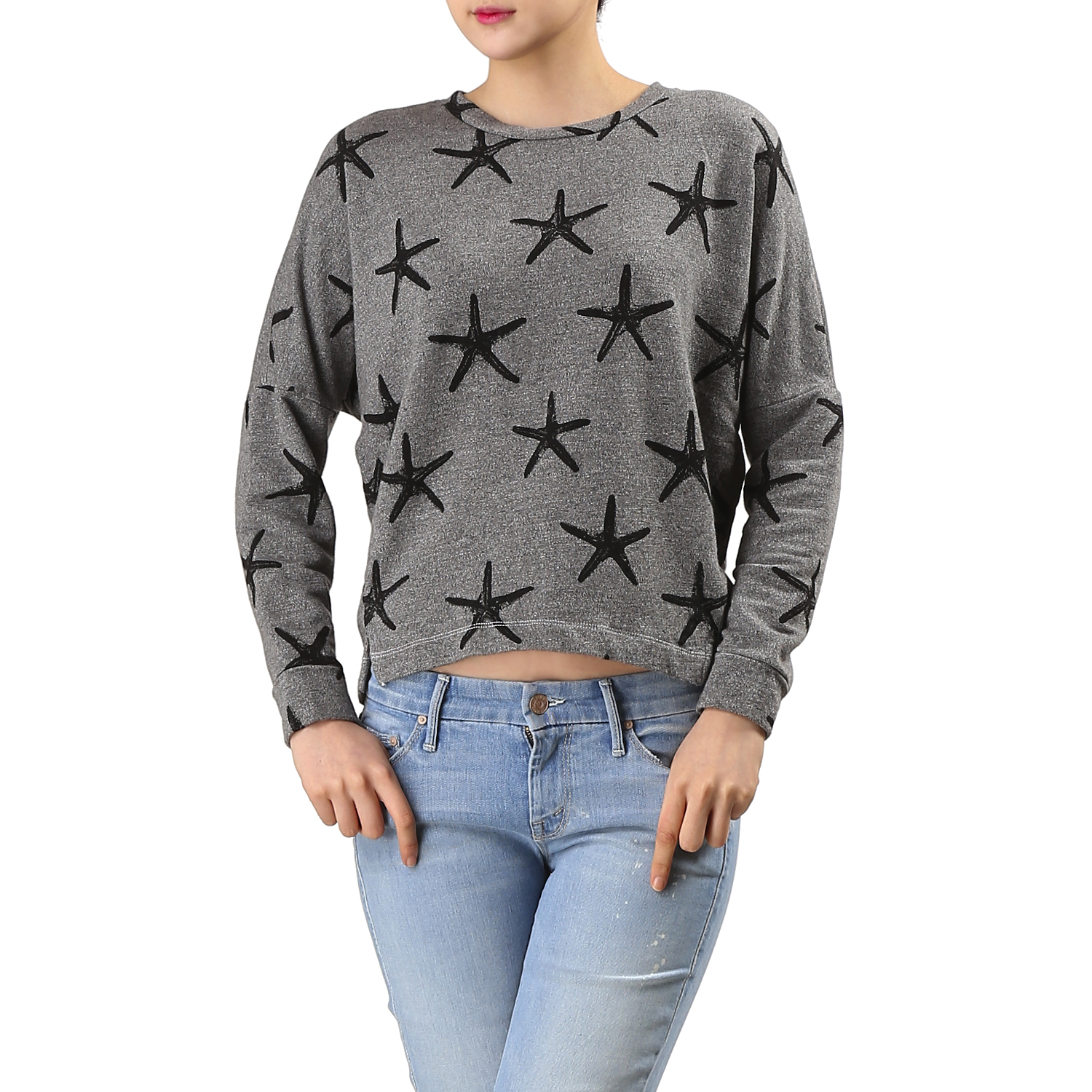 | 별무늬 프린팅 긴팔 티셔츠 입니다. 나그랑 디자인에 소재가 부드러워 편하게 입기 좋은 아이템 입니다. 길이는 앞면이 조금 짧은 편 입니다. | |