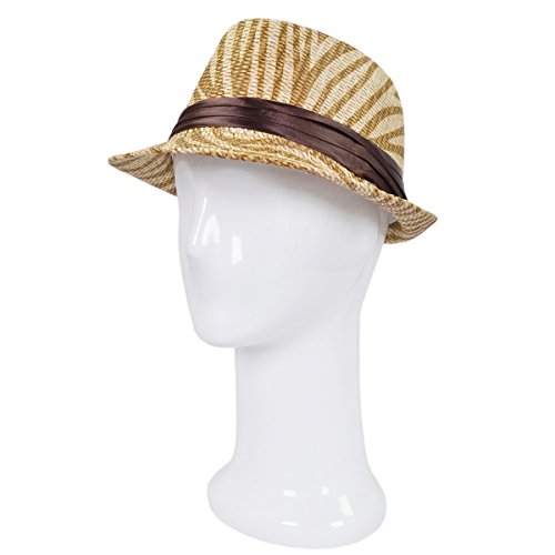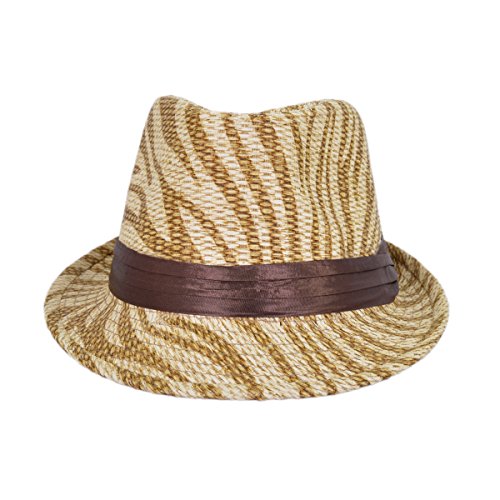 -. Binding : Apparel -. Brand : TrendsBlue -. ClothingSize : One Size -. Color : Light Brown -. Department : womens -. Feature : Brand new, made from paper straw / One size fits most / Premium Quality / Polyester / Also available in dark brown zebra print, see other listing -. ProductGroup : Apparel -. ProductTypeName : HAT -. Size : One Size -. Title : Light Brown Zebra Print Ribbon Band Fedora Straw Hat