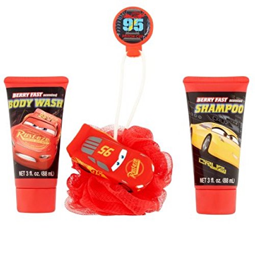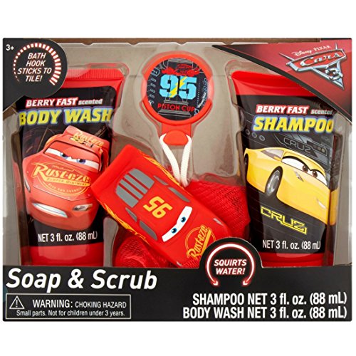 - Disney PIxar Cars 3 Shampoo and Body Wash with a bath scrubby and hook to hang it on the tub.