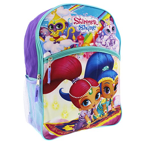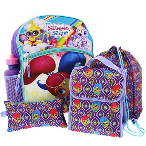 Product Description This Nickelodeon set includes a 16 inch backpack, an insulated lunch bag, a water bottle, utility pencil case, and a matching ruck sack. Your child can easily carry books, gym clothes, pencils, and more! The day pack features a roomy main compartment, side mesh pockets, and a front zip compartment that is perfect for smaller supplies. The book bag can be hung up when not in use by the webbed locker loop. The matching lunch bag makes lunchtime fun and exciting with an insulated interior, hook and loop closure, and a holding strap for easy carrying. This set features images of your favorite little genies-in-training, Shimmer and Shine, and their cute pets, Nahal and Tala! It's the perfect back to school choice for any fan of Nick Jr.'s Shimmer Shine! 0