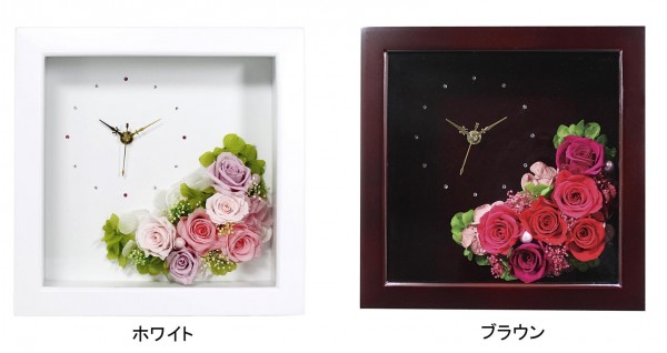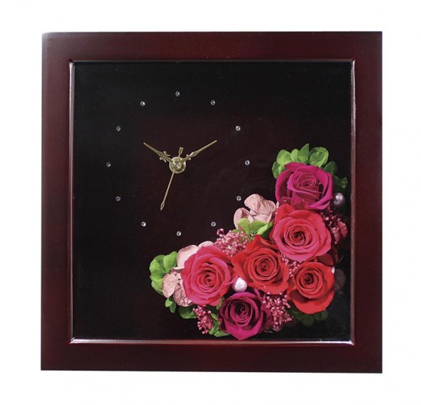 | 「枯れないお花」プリザーブドフラワーとラインストーンが華やかな時計です。日本製クォーツを使用しています。お部屋にあわせて置いても掛けても♪ |