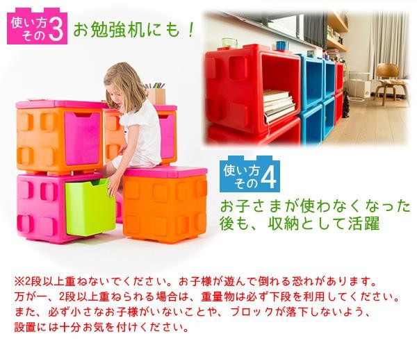 カラフルなキューブ型ボックス収納をつなげて、楽しく収納♪ボックスの天板にボックストップ(別売)をセットすれば、イスやお絵かきテーブル、お勉強テーブルにもなります。使い方次第で様々な用途として使えてとっても便利!!使わなくなった後も通常の収納としても使用可能です。カラフルなBOXはお部屋の明るいアクセントにもなります。 |