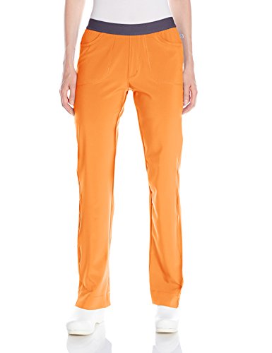 - Low rise work pant featuring pull-on elastic waistband and faux fly