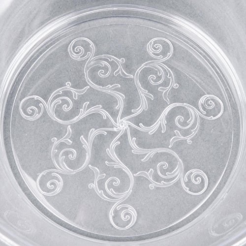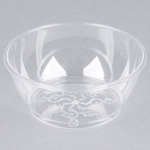 Studio : Fineline Settings Publisher : Fineline Settings Binding : Health and Beauty Product Description Delicate in detail and durable in design, this Fineline Savvi Serve 310 clear 6 oz. disposable plastic bowl gives you sophistication and visual appeal without the time-consuming cleanup! With a swirled design running along the bottom of the bowl and a cleverly constructed rounded rim that helps prevent spills, this crystal clear plastic bowl is a beautiful and convenient way to serve soups, desserts, and more! 0