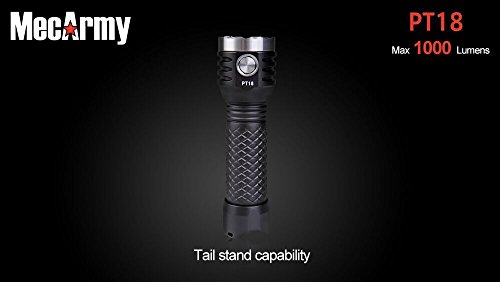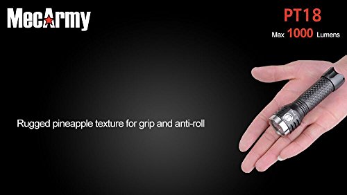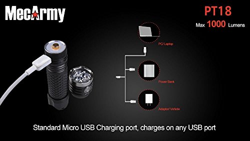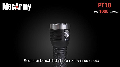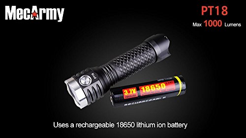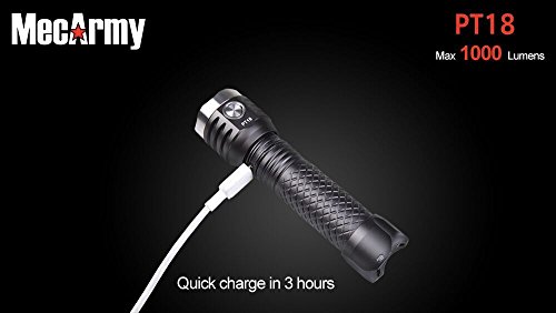 -. Feature : Compact, powerful LED flashlight that uses 3 CREE XP-G2 LEDs with a maximum output of 1000 lumens and a beam distance of 140 meters / Has 5 lighting modes (Turbo, High, Medium, Low, and Strobe) with instant access to the Turbo mode and the Strobe mode and an electronic side switch making it easy to change modes and turn ON and OFF the flashlight / Uses a rechargeable 18650 Lithium-Ion battery which can be charged with a standard Micro USB charging port and charges in 3 hours / Constructed from aero grade aluminum alloy making the PT18 waterproof up to IPX-8 standard and has a red pineapple texture for grip and anti-roll / Comes with a 5 year MecArmy warranty