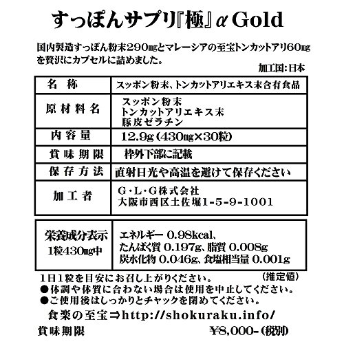 主要成分(サプリメント・化粧品):すっぽん 極 α Gold <すっぽん、トンカットアリエキス>/Saw palmetto ソーパルメット<ノコギリヤシエキス末、酵母亜鉛>(原材料の一部に、ゼラチンを含む)