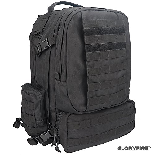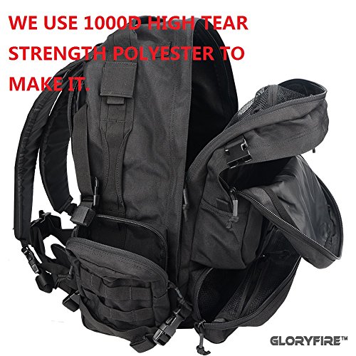 The GloryFire 3-Day Assault Pack is constructed of heavy duty polyester material and the MOLLE compatibility will allow you to attach med kits, magazine pouches, hydration pouches and just about anything else you can stand to carry. Tactical compact assault pack size approx.: 22"H x 17"W x 11"D; 3038 cubic inches ; Military backpack is made of 1000D high density fabric--durable and water-resistant.