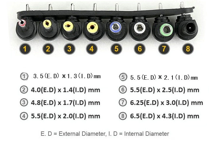 输出端子: 八种接口选择 6.0mm*4.0mm(带针) 6.3mm*3.0mm 5.5mm*2.5mm 5.5mm*2.1mm 5.5mm*1.7mm 4.8mm*1.7mm 4.0mm*1.7mm 3.5mm*1.35mm