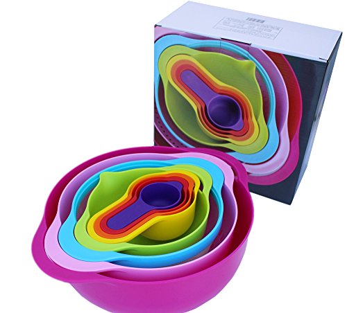 - DURABLE CONSTRUCTION PLASTIC MEASURING CUPS & BOWLS: These measuring cups along with the mixing bowls, the sieve shaker and colander are made from high quality materials. They are BPA free and safe to be used on a daily basis to make delicious goodies for you and your beloved family! Forget all about cheaply made bowls, scratchy metal bowls or easy to break glass ones and trust this ultra-resilient mixing set!