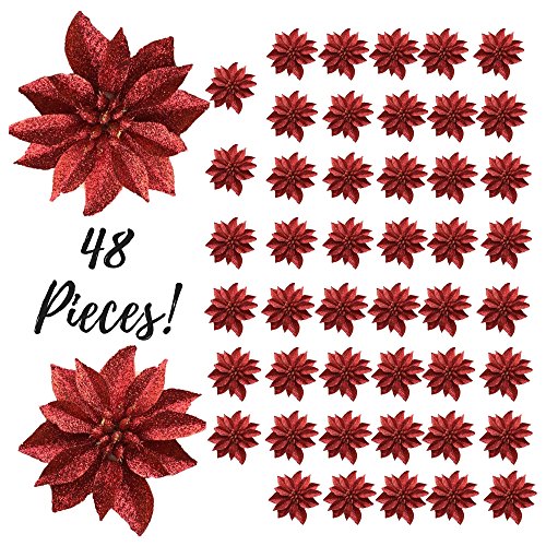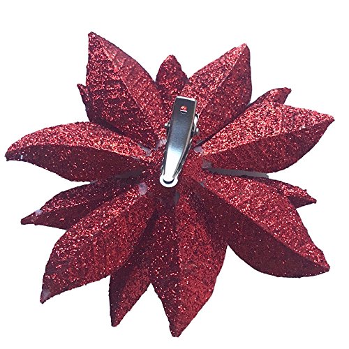 Artificial Poinsettia Flowers - Set of 48 - 3 3/4" Red Glittered Poinsettia Clip On Ornaments - Christmas Decorations - Decorative Floral Accessories