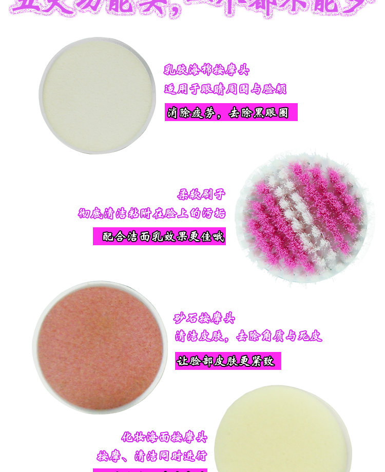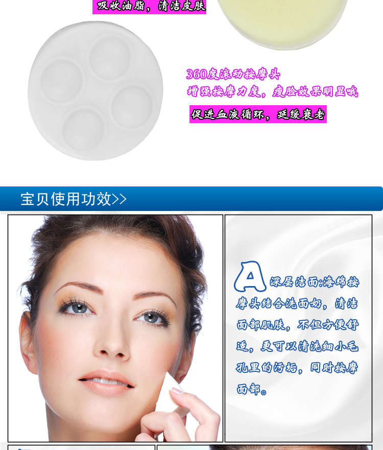 3:“化妆海绵”配头:洗完脸后,可以用此按摩头再次对脸部肌肤进行按摩,进一步缓解脸部肌肤的疲劳,舒缓神经,改善肌肤血液循环。