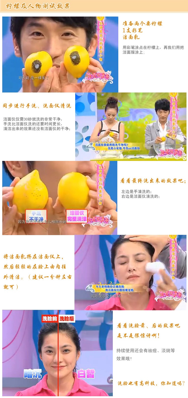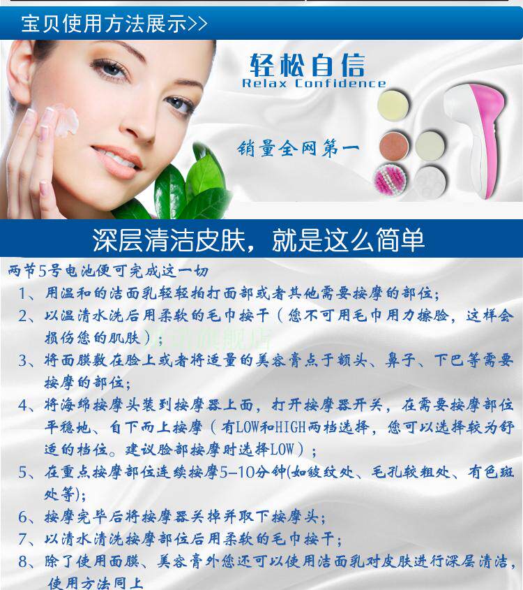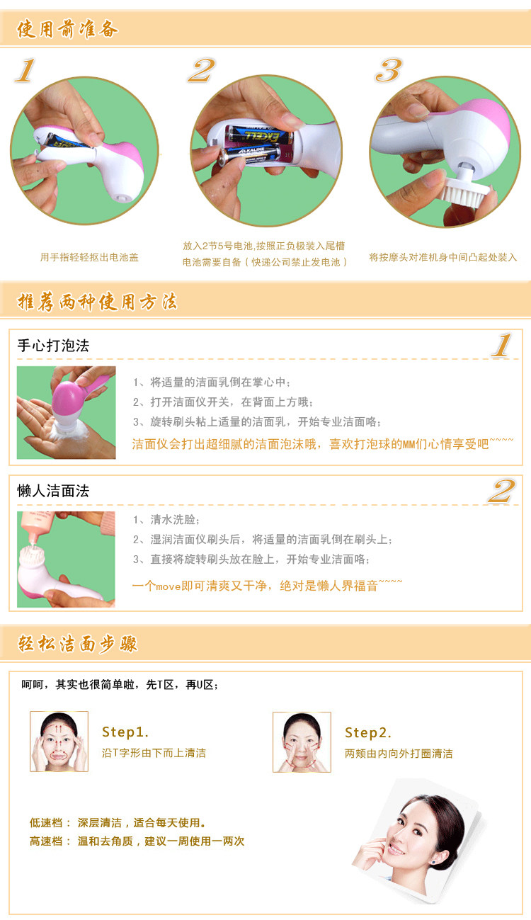 4:“乳胶美容棉”配头:结合洗面奶或洗面啫喱,清洁面部肌肤。将脸部打湿,抹上洗面奶,借助此机器清洗脸部,不但方便舒服,更可清洗细小毛孔里的污垢,同时按摩脸部。