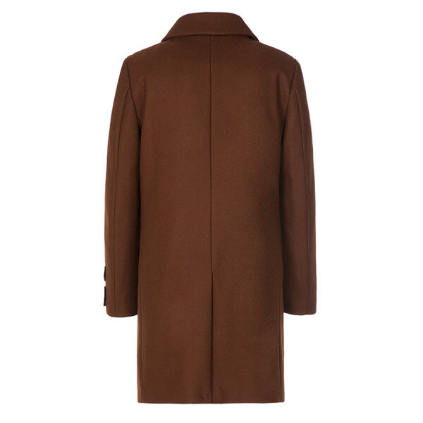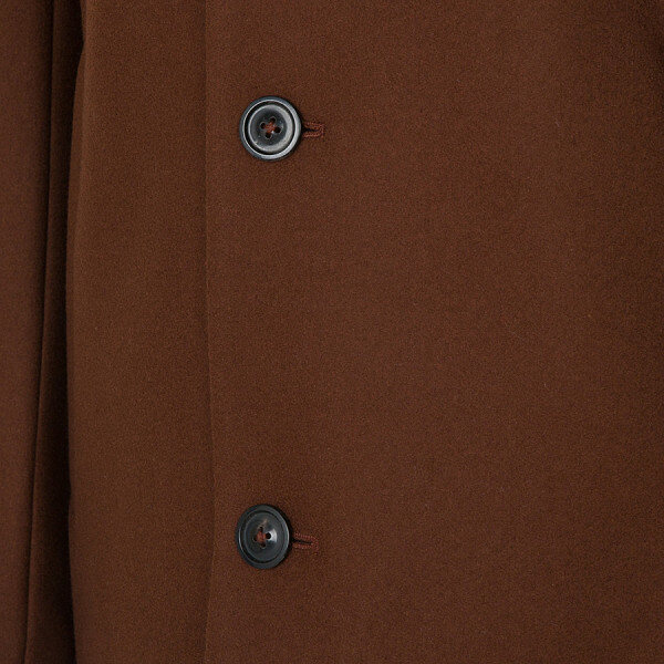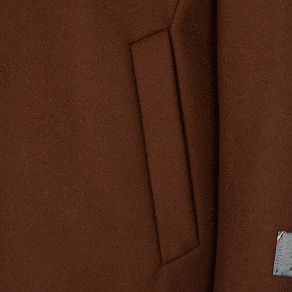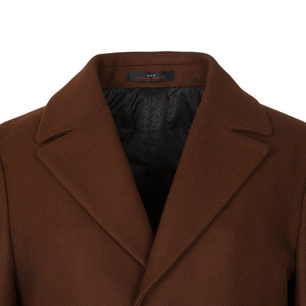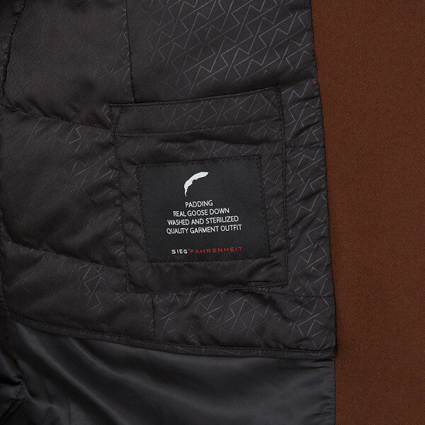 SIEG °FAHRENHEIT이태리 'FORTEX'의 캐시미어가 함유된 브릭 컬러 멜톤 소재로 3-BT 넓은 라펠 형태의 롱코트. 부착형 다운 라이너 사양으로 보온성을 줌.