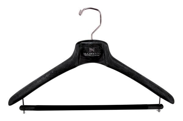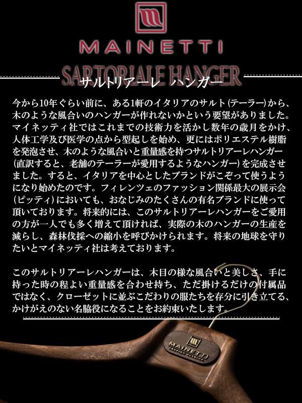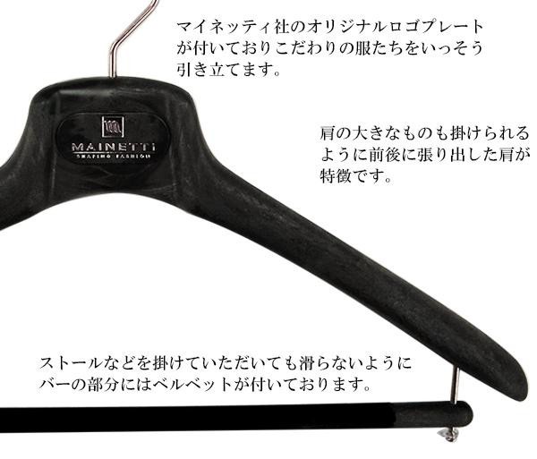 メンズハンガーとほぼ同じ形ですが、肩先(両端)を太くしたコートハンガー。コートのような肩の大きなものも掛けられるように前後に張り出した肩が特徴です。お好みでジャケットを掛けることもでき、バーの部分にはストールなどを掛けることもできます。 |