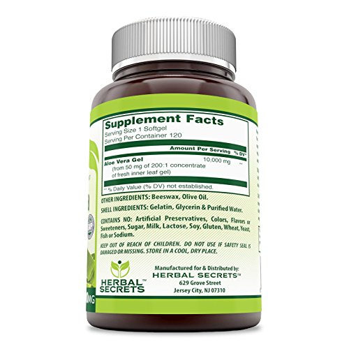 -. Feature : Herbal Secrets Aloe Vera 10000 Mg, 120 Softgels, New Improved Formula With Extra Virgin Olive Oil, Easier To Take Than Juice, Drink And Gel Products, A Natural Remedy To Soothe The Stomach Or For Detox / A Natural Remedy To Soothe The Stomach Or For Detox / Easier To Take Than Juice, Drink And Gel Products / Soothes Digestive Track / Regulates Intestinal Bacteria