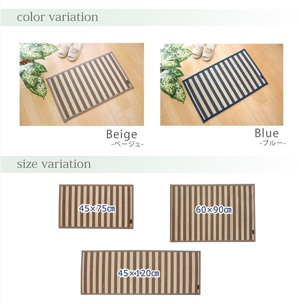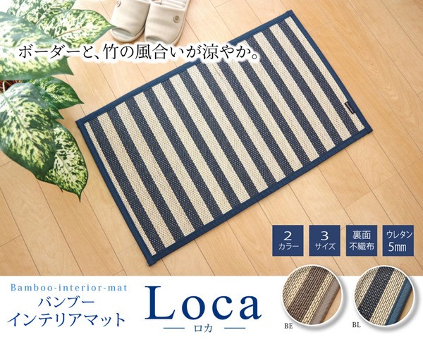 【商品名】 マリンストライプ 竹玄関マット 『DXロカ』 ブルー 約60×90cm 【ジャンル・特徴】 竹製 玄関用ラグマット シート ■サイズ・色違い・関連商品■玄関マット 約45×75cm ベージュ■玄関マット 約45×75cm ブルー■玄関マット 約60×90cm ベージュ■玄関マット 約60×90cm ブルー[当ページ]■キッチンマット 約45×120cm ベージュ■キッチンマット 約45×120cm ブルー関連商品の検索結果一覧はこちら マリンテイストのバンブーラグです。竹の素材感を残しながら、カラー糸によりデザインを表現しています。さらっとした足触りと裏面に不織布を使用しているため底付き感を軽減してくれます。フローリングにもぴったりの商品です。竹は耐久性に優れ、熱伝導率が高いため自然のひんやり感があります。■商品スペック【サイズ】約60×90cm【素材】表地=竹 裏地=ポリエステル100%(不織布) 中材=ウレタンフォーム5mm ヘリ=PP100%【洗濯表示】洗えません。【原産国】中国製【配送日時指定について】・この商品は、配送希望日と時間帯をご指定可能です。・配送希望日