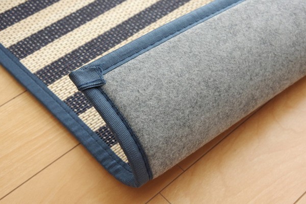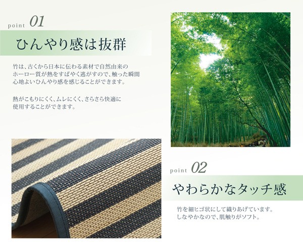 マリンテイストのバンブーラグです。竹の素材感を残しながら、カラー糸によりデザインを表現しています。さらっとした足触りと裏面に不織布を使用しているため底付き感を軽減してくれます。フローリングにもぴったりの商品です。竹は耐久性に優れ、熱伝導率が高いため自然のひんやり感があります。