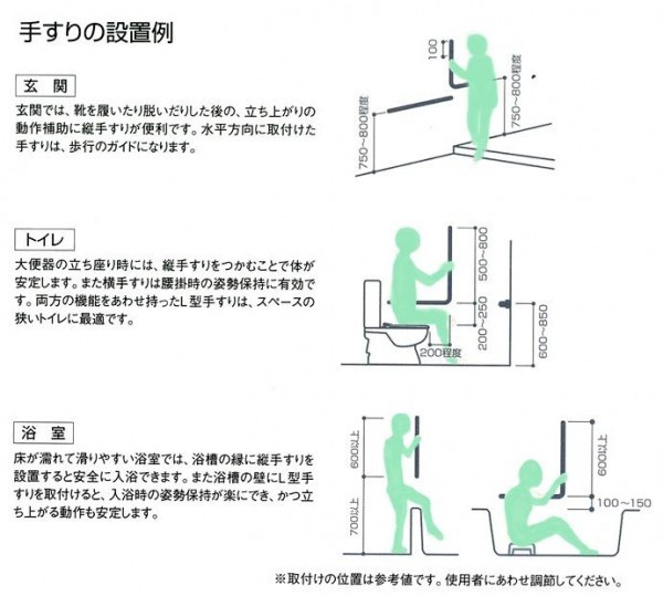 | 家庭内における高齢者の事故は、手すりがあれば未然に防ぐことが出来たかもしれない事故が半数以上を占めています。トイレや階段、お風呂場、廊下など、動作補助にお役立てください。 |