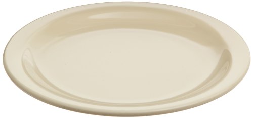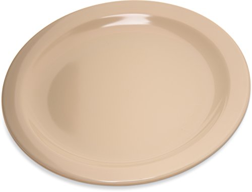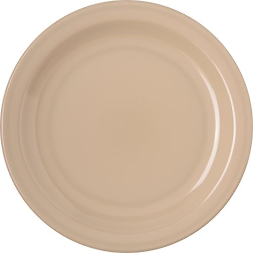 This Carlisle 4350325 tan Dallas Ware salad plate is stackable and has a reinforced rim and foot. It is made of melamine for durability and resistance heat and is safe for temperatures up to 212 degrees F. It is resistant to staining and scratching. This salad plate meets NSF International standards for use in food handling and processing, and National Institute of Standards and Technology (NIST) standard PS25-70 for heavy duty melamine tableware. It measures 0.74" in height and 7.19" in diameter.