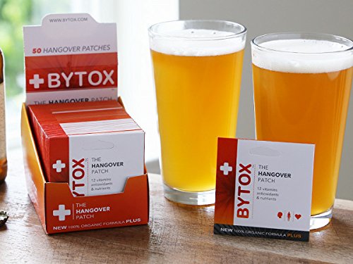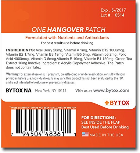 Studio : Bytox Publisher : Bytox Binding : Health and Beauty Product Description Alcohol is a diuretic that causes the depletion of beneficial nutrients and vitamins from the body, the most important of which is vitamin B12. One Bytox patch contains 1000mcg's of vitamin B12 and other B vitamins, which together make up the vitamin B complex. The vitamin B complex in conjunction with other supplements, such as the kind provided by Bytox, may help restore balance to the body and can assist it in replenishing depleted nutrients resulting from alcohol consumption. The vitamin B complex as well as many other nutrients are rapidly depleted from the body due to the diuretic effect of alcohol. The loss of these nutrients adversely affects the central nervous system, which creates the condition we all know as the "the hangover." The BytoxTM Hangover Patch can help replenish these nutrients, thus potentially assisting the body in restoring its natural balance. INGREDIENTS: Acai Berry 20mg, Vitamin A 1mg, Vitamin B12 1000mcg, Vitamin B2 1.7mg, Vitamin B3 19mg, Vitamin B5 5mg, Vitamin B6 2mg, Folic Acid 4000 mcg, Vitamin D 5mcg, Vitamin E 10mg, Vitamin B1 150mg, Green Tea Extract 10mg. Inactive Ingredients: Acrylic Copolymer Adhesive. The Patch does not contain latex. 0