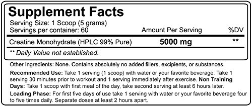 ReleaseDate : 2015-04-24 Studio : NutraKey Publisher : NutraKey Binding : Health and Beauty Product Description Creatine monohydrate is naturally produced in the human body from amino acids primarily in the kidney and liver. It bonds with phosphorus in the body makin creatine phosphate which is a high energy compound used by muscles for instant energy needs. Muscles that perform high energy movements frequently will have and require much larger concentrations of creatine, free form aminos, and proteins. Holding more creatine means your body will physically be able to perform more work. Supplementing with creatine can boost muscle size, strength and endurance, improve athletic performance, and speed muscle recovery. 0