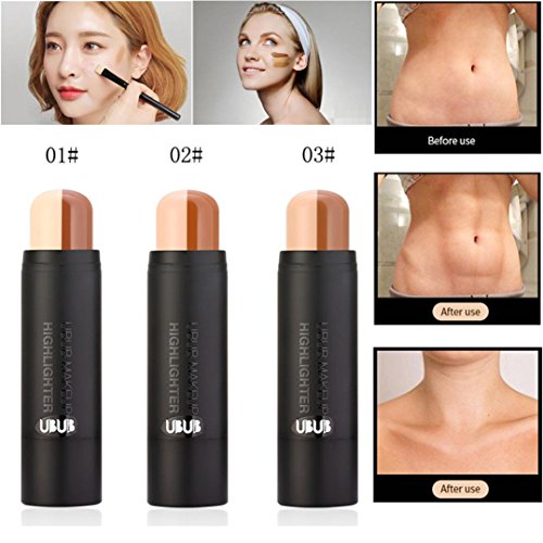 Feature: Benefit: Moisturizer,Oil-control,Waterproof / Water-Resistant,Whitening,Freckle Removing,Acne/Spot Removing,Brighten,Concealer,Natural,Nutritious Material: Magnesium Stearate, Talc Formulation: Cream NET WT: 6g Color: 2 color Skin Type: All Skin Types Gender: Unisex Brand Name: UBUB Pen-style, simple and portable to carry. Contour or highlight you cosmetic skin with the cream highlight stick crayon. It is a multi-purpose stick that can be used on eyes, cheeks, lips and body to give you a sheer shimmer.