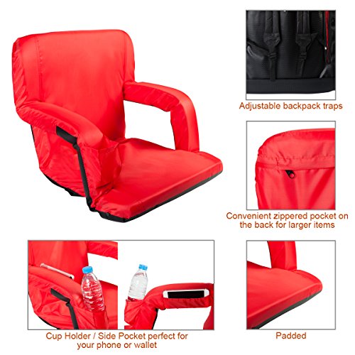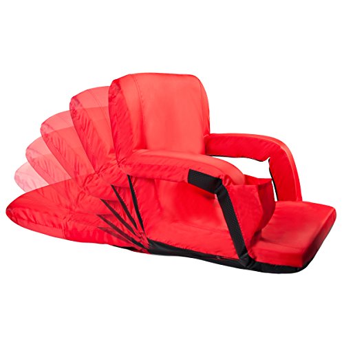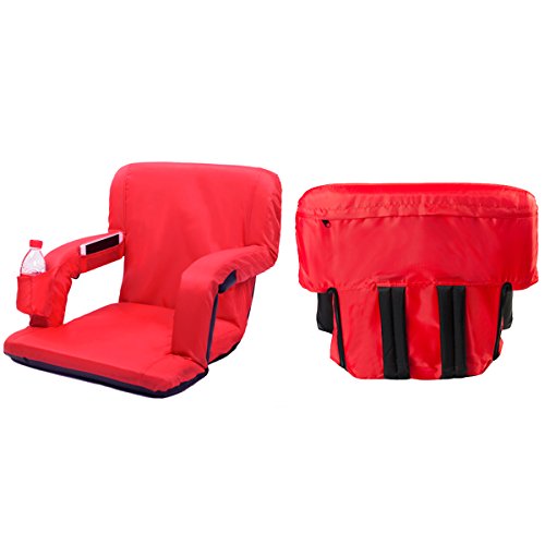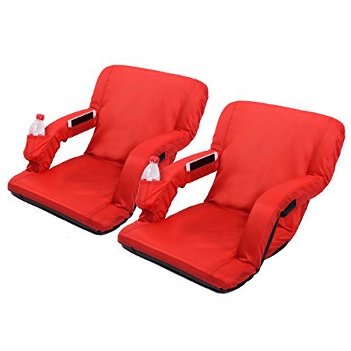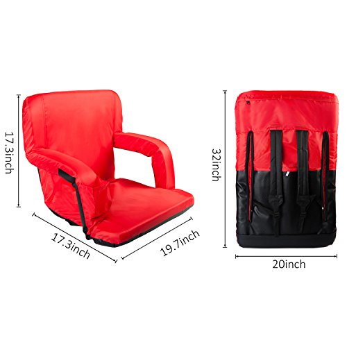 AceLife Stadium Seat Portable Reclining Bleacher Chair with Cup Holder and Phone Pocket - Set of 2, Red Specifications: - Cover Material: 420 Polyester;bottom fabric:pvc leather - Steel tube: Dia0.75*0.04inch - Multiangle: 5 Position - Product Size(LxWxH): 32*20*2inch - Gross Weight: 15lb -Package: 2xFloor Armchair Description: This comfortable, portable padded seat is so versatile, Enjoy reclining at the beach, sitting at the park, sporting events, camping, bleachers and more ,It comes with 5 reclining positions, adjustable backpack style straps for easy carrying and padded armrests for extra comfort. It can be adjusted to completely flat so you can easily store it in your closet or just place it under your sofa when you don't use it.