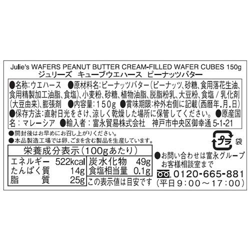 原材料:ピーナッツバター(ピーナッツ、砂糖、食用落花生油、食用精製加工油脂、食塩)、小麦粉、砂糖、植物油脂、脱脂粉乳、大豆粉、食塩/乳化剤(大豆由来)、膨張剤