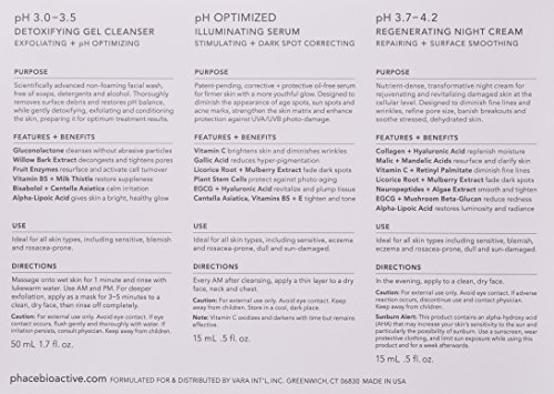 Detoxifying Gel Cleanser, 50mL: Scientifically advanced, non-foaming facial wash, free of soaps, detergents and alcohol. Thoroughly removes surface debris and restores pH balance, while gently detoxifying, exfoliating and conditioning the skin, preparing it for optimum treatment results. Illuminating Serum, 15mL: Patent-pending, corrective + protective oil-free serum for firmer skin with a more youthful glow. Designed to diminish the appearance of age spots, sun spots and acne marks, strengthen the skin matrix and enhance protection against UVA/UVB photo-damage. Regenerating Night Cream, 15mL: Nutrient-dense, transformative night cream for rejuvenating and revitalizing damaged skin at the cellular level. Designed to diminish fine lines and wrinkles, refine pore size, banish breakouts and soothe stressed, dehydrated skin.Feature