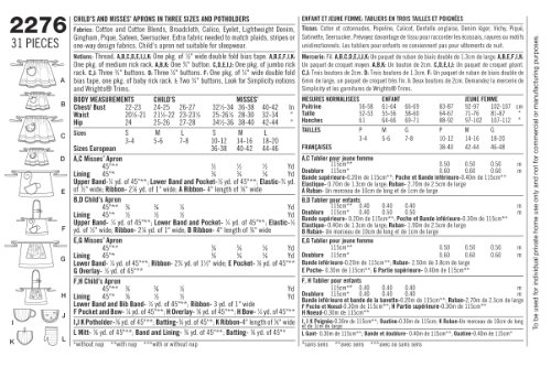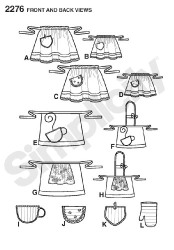 -. Feature : Child's and misses' aprons in size a (s - l / s - l), simplicity pattern 2276 / Number of looks included:12 / Instructions are written in english and spanish / Designed and manufactured in the USA / Sested fabrics: cotton and cotton blends, broadcloth, calico, eyelet, lightweight denim, gingham, pique, sateen, seersucker; extra fabric needed to match plaids, stripes or one-way design fabrics; child's apron not suitable for sleepwear