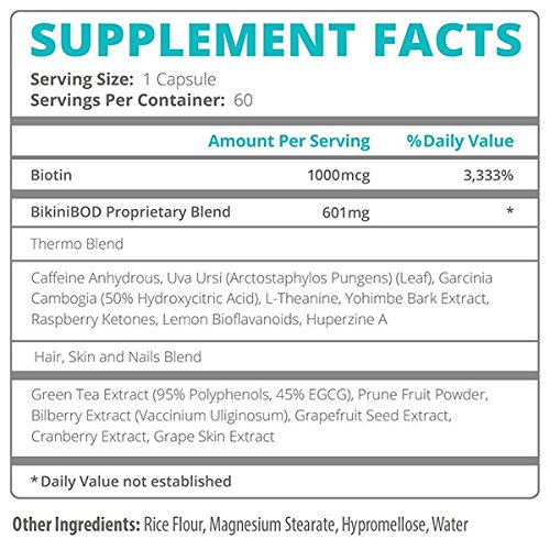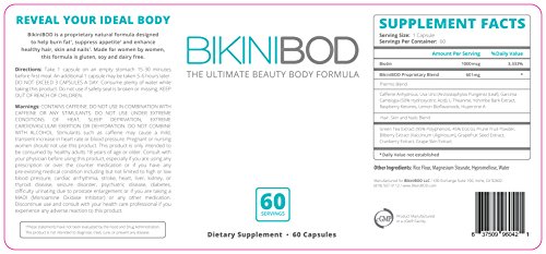 -. Binding : Health and Beauty -. Brand : BikiniBod -. EAN : 0637509960421 -. Feature : The Ultimate Beauty Body Formula: a premium, 100% vegan hunger suppressant and metabolizer pill made for women, by women. 1 capsule per serving, 60 servings per bottle. / Ingredients included: Caffeine Anhydrous, L-Theanine, Raspberry Ketones, Garcinia Cambogia, Green Coffee Bean Extract, Yohimbe Extract, Huperzine, Uva / BikiniBOD is Non-GMO Verified, Doctor TrustedTM Certified and proudly made in California, USA in compliance with current Good Manufacturing Practice (GMP) regulations. No artificial dyes, colors or flavors. / Gluten-free high-profile, naturally-derived weight loss ingredients featured on The Dr. Oz Show, including powerful & natural fat burning & blocking formula with biotin & a berry antioxidant blend for optimum hair, skin & nail radiance and health. / We know you'll love BikiniBOD, but you can rest easy thanks to our 90-Day 100% Money-Back Guarantee. -. IsAdultProduct : 0 -. Label : BikiniBOD -. Manufacturer : BikiniBOD -. MPN : bikinibod-001 -. PackageQuantity : 1 -. PartNumber : bikinibod-001 -. ProductGroup : Health and Beauty -. ProductTypeName : HEALTH_PERSONAL_CARE -. Publisher : BikiniBOD -. Studio : BikiniBOD -. Title : BikiniBOD All Natural, Vegan Weight Loss & Beauty Pill for Women -. UPC : 637509960421