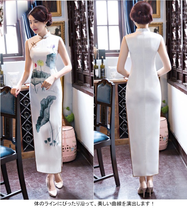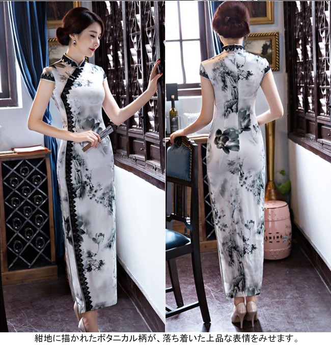 華やかな上品な花草柄が施されたロング丈のチャイナワンピース! | |