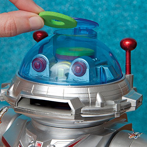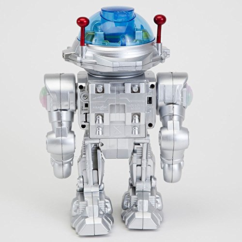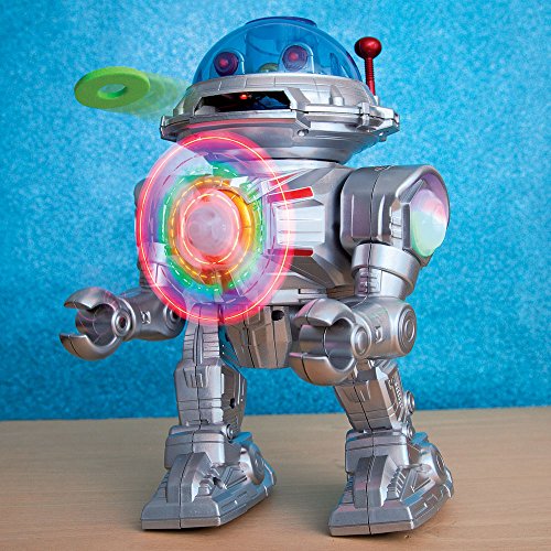 The Amazing Star Defender Robot is a walking, talking, shooting, moving, spinning and flashing robotic action toy. Press the on switch and he magically comes to life, automatically walking forward, shooting 12 soft foam discs into the air. The Amazing Star Defender Robot shouts "3-2-1-FIRE!" while multiple sound effects and colorful lights flash from his arms, chest, and eyes. A fun action toy for science fiction fans and robot fanatics. Requires 4 AA batteries, not included. Amazing Star Defender Robot measures 9-1/2" tall x 6-3/4" wide x 5" deep. Robot toy is made of plasticFeature