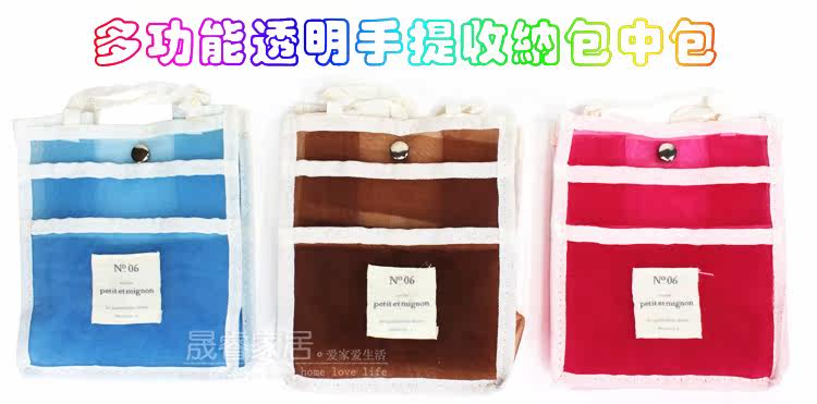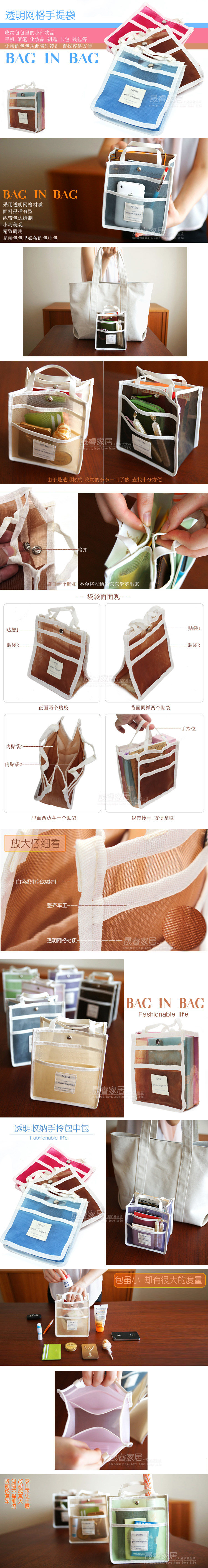 This versatile package bag with nylon mesh material, meticulous workmanship, transparent design, the stuff inside is clearly visible, large interior space, retains both the front and rear exterior adherent bag, can put some small items to carry, portable design, small it is a small thing can put a lot of Oh!