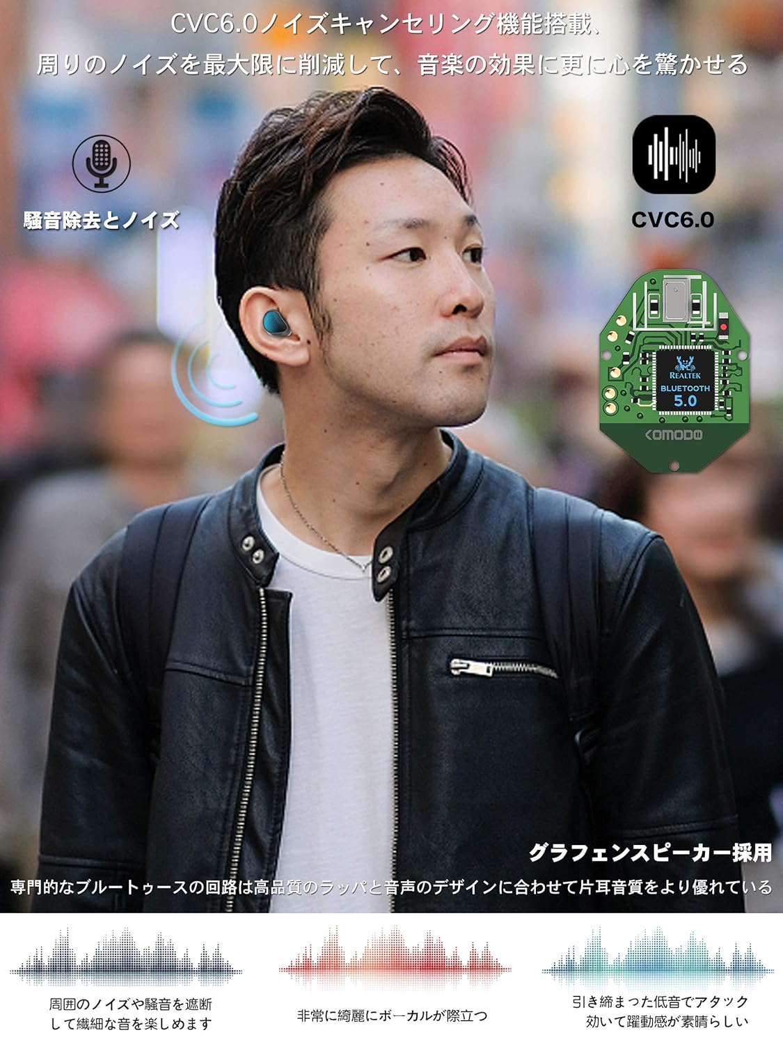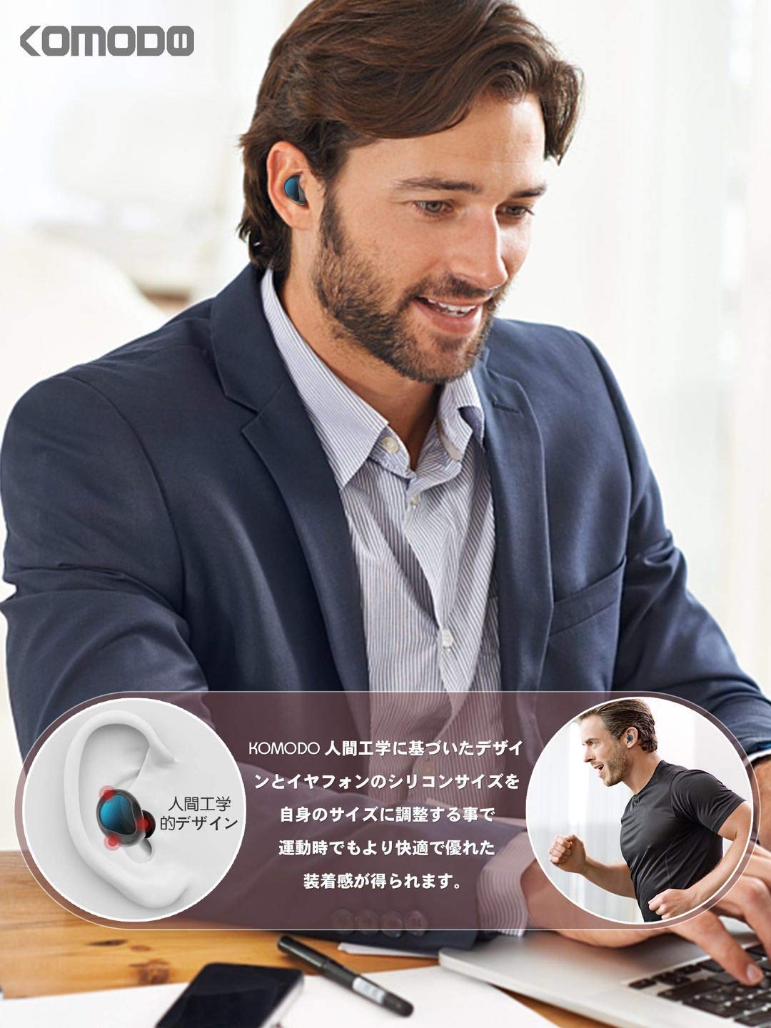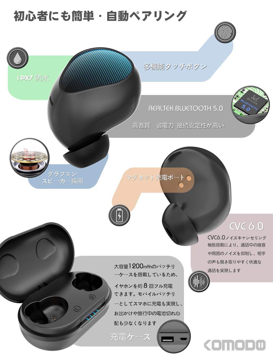 ●【最先端Realtek Bluetooth 5.0チップ搭載】 KOMODO両耳ワイヤレス ブルートゥース イヤホンは、最先端のRealtek Bluetooth 5.0技術を採用して、消費電力が低くて、両耳通話にも対応しています。今までのBluetooth 4.2イヤホンより、信号が強くて、強力になったBluetooth接続性能を持ち、2倍のデータ送信速度と8倍のデータ転送能力、約4倍の通信範囲が可能になりました。簡単・高速かつ途切れのないペアリング接続を体験できます。