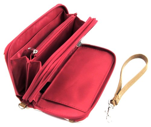 - Feature : Zippered coin compartment / 4 slip compartments and 2 gusseted pockets / 1 ID window and 5 card slots / Back pocket and detachable wrist strap / Measures approximately 7.75? x 4? x 1?